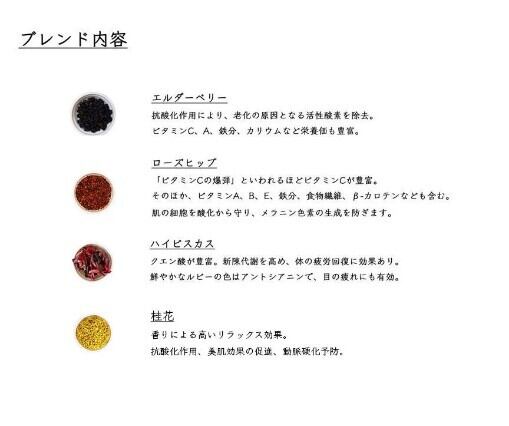 クエン酸が豊富なハイビスカス、ビタミン豊富なローズヒップとエルダーベリーに加えて、桂花のリラックス効果抜群の香りが、肌や疲れた心身をサポート。