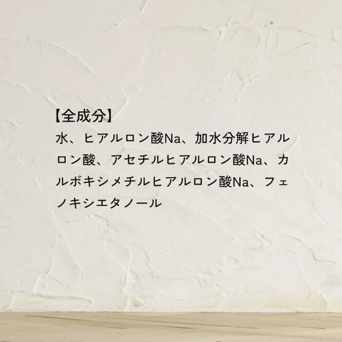 水、ヒアルロン酸Na、加水分解ヒアルロン酸、アセチルヒアルロン酸Na、カルボキシメチルヒアルロン酸Na、フェノキシエタノール